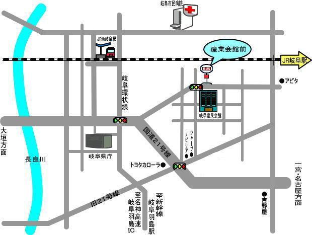 JR岐阜(ターミナル内)5番乗り場及び 名鉄岐阜 1番乗り場より、「県庁」・「OKBふれあい会館」行きに乗車「産業会館前」下車。