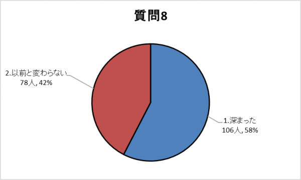 - 質問8 「水のこえ」では、水道・下水道事業について利用者の皆様にお伝えしたいこと(上下水道事業部の取組、今後の課題と対応策等)について特集し掲載しています。「水のこえ」第48号を読んで、水道・下水道事業に対する理解は深まりましたか?