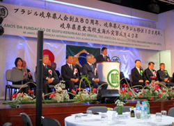 ブラジル岐阜県人会創立80周年・岐阜県人ブラジル移住105周年・岐阜県農業高校生海外実習派遣40年記念式典に出席し、あいさつ(サンパウロ市)