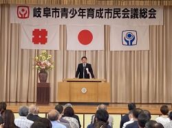 令和6年度岐阜市青少年育成市民会議総会に出席し、あいさつ及び表彰状・感謝状贈呈(岐阜中央中学校 第二体育館)