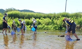8組26人の親子が参加し、川の生きもの捕りをして、生きものからわかる水質について学びました。