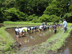 次に、達目洞の田んぼでの田植えを行いました。ここでの田植えは、機械で植えることができないため全て人の手で行わなくてはいけません。