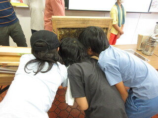 子どもたちは興味津々で話を聞きながら、じっくり観察し、女王蜂を探したり、羽化する蜂を観察したりしていました。