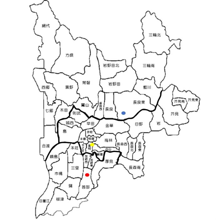 本荘・市橋・三里・鏡島 鶉・日置江・柳津 加納東・加納西・茜部・厚見 |