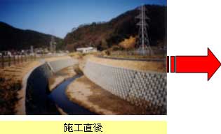 - ポット形状の護岸ブロックを用い、その中に発生土を詰めることにより、植生を促す。