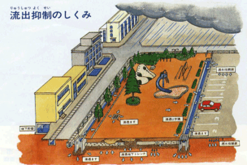 岐阜市では、小・中学校や公園など公共施設の敷地(グランド・校庭等)を利用して、雨水を一時貯留し、雨水流出抑制を図っています。境川流域では、総合治水の「流域対策」の一環として、「流域貯留浸透事業」を、その他の浸水被害が発生している地域では、「校庭貯留施設整備事業」を実施しています。