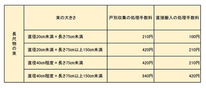 太い枝等は、粗大ごみです。1m程度の長さに切って、枝を束ねた状態で、粗大ごみ受付センターへお申し込みください。処理手数料は、束の大きさにより異なります。