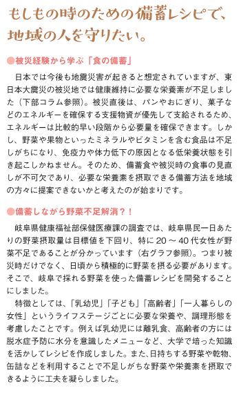令和元年度は、岐阜市立岐阜女子短期大学とコラボレーションし、同大学の食物栄養学科の女子学生達が「備蓄レシピ」を考案されましたので、併せてご紹介します。