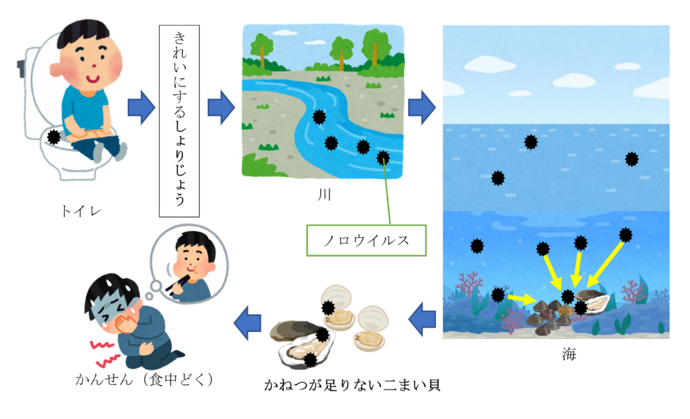 人が二まい貝を生やかねつが足りないまま食べると、貝の中にあつまっているノロウイルスも食べることになり、かんせんします。