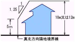 真北方向にあたる隣地境界線又は道路の反対側の境界線からの斜線による制限で、第1種低層住居専用地域及び第2種低層住居地域専用地域に適用されます。