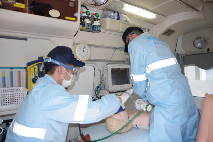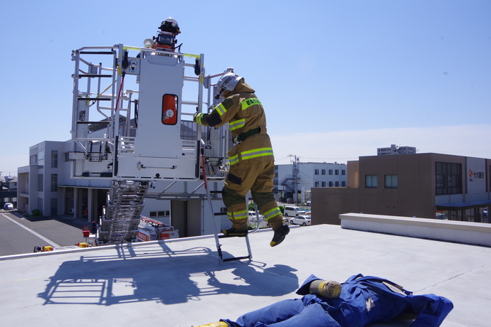 梯子車に搭乗し、高所に取り残された要救助者を救出する体験を実施します。